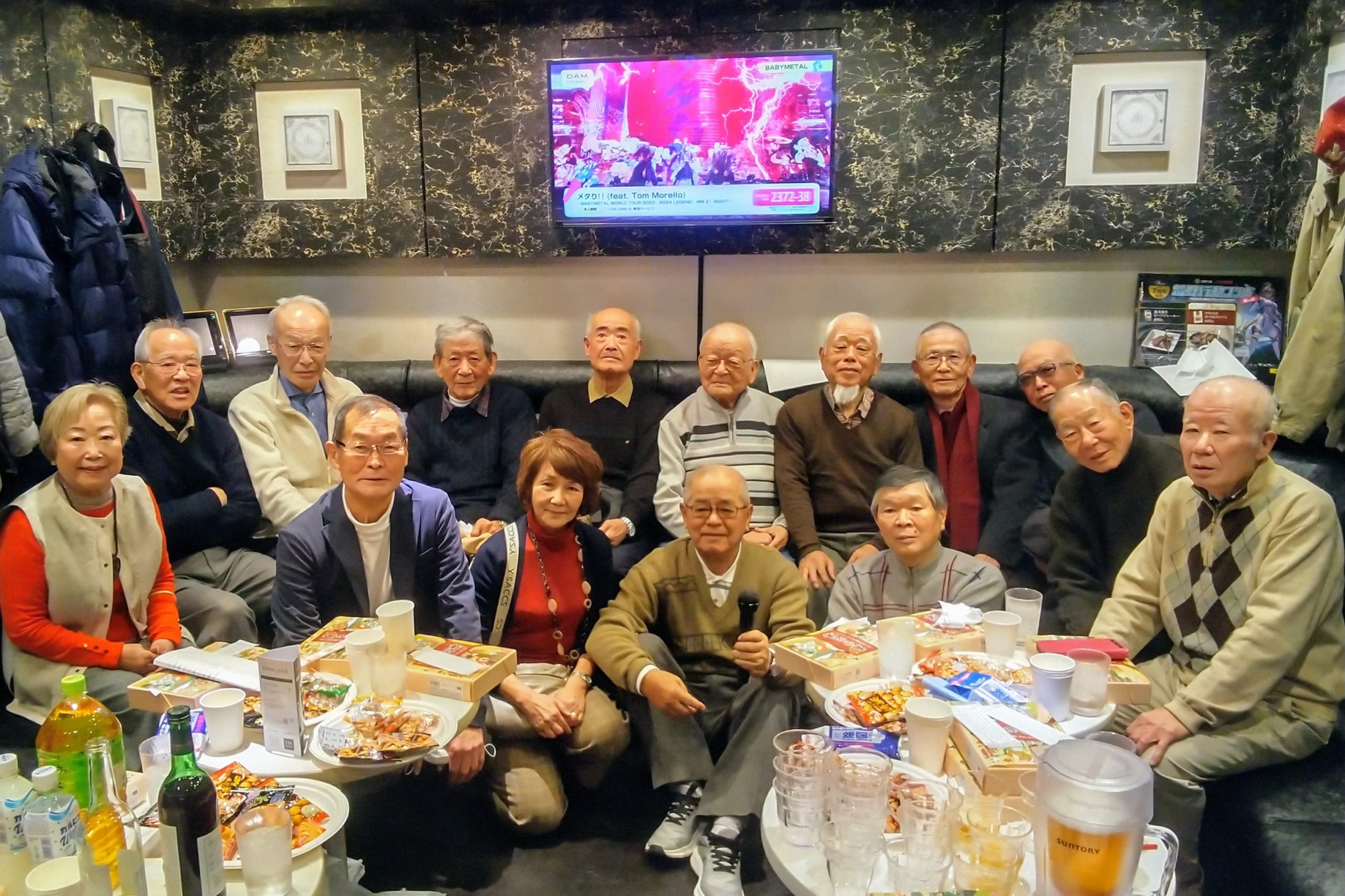 今年一番の厳しい冷え込みの中、新年会に歌好き15名が集まりました。嬉しいことに、阪和サロンから寺田孝行さん、京滋サロンから辰巳勝彦さんと石川壽夫さんが初参加されました。最初に、初参加のお三方からご挨拶いただき、中市さんの乾杯発声で始まりました。淡路屋さんのお弁当と焼酎、赤白ワインでお腹を満たした団らんのあと、中市さんが「ワルツ調愛唱歌63曲」、「冬の歌36曲」のリストを作成持参いただき、五木ひろしの「汽笛」からスタート、そして美空ひばり、石原裕次郎、フランク永井、東京ロマンチカなど45曲(お一人3曲ペース?)で熱唱が続きました。カラオケルームは2部屋用意し、3時間半の熱唱タイムでした。お開きは、「中之島・港町・盛り場ブルース」を全員で合唱し締めくくりました。