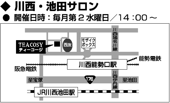 川西・池田・宝塚・箕面・猪名川・伊丹・三田・豊中・尼崎エリア在住の方を中心に構成しているサロンです。年2回の食事会、春・秋の「歴史散歩」として近郊の散策会も実施しています。どうぞお気軽にお立ち寄り下さい。